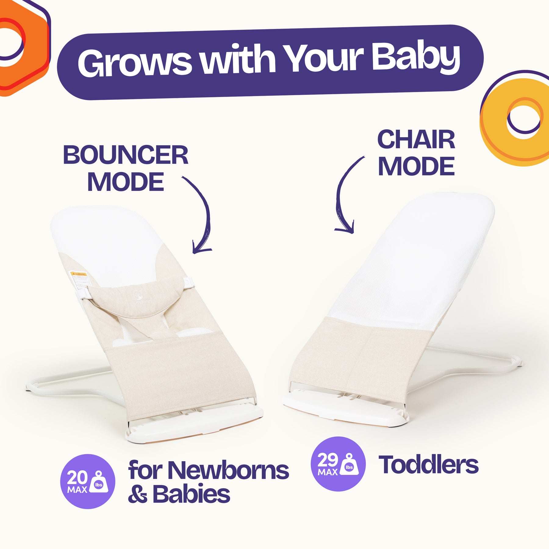 ComfyBumpy’s baby bouncer seat features (3) adjustable height positions for babies and toddlers (Play, Rest, and Sleep). There is also the added position of folding the bouncer seat flat for storage or for transport. When your little ones can stand on their own, you can turn our ComfyBaby rocker into a chair!