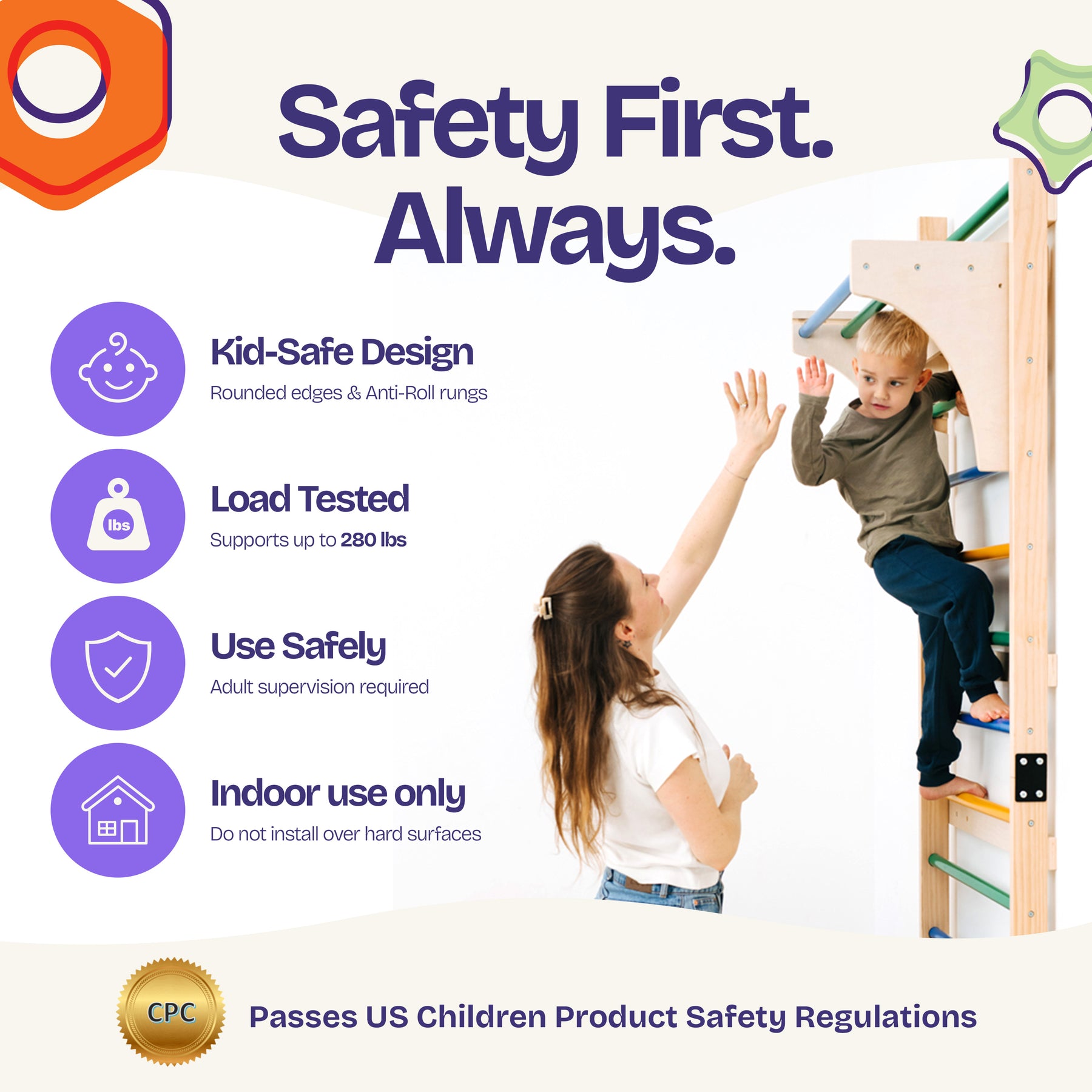 • CERTIFIED SAFETY: ComfyBumpy Swedish Ladder is CPC certified, and passes rigorous safety standards set by the federal government.